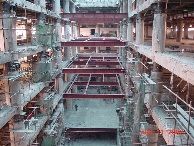 為增加營業(yè)面積,濟(jì)南銀座商城八一店采用鋼結(jié)構(gòu)將挑空部分增加五層,圓柱節(jié)點(diǎn)采用化學(xué)植筋結(jié)合粘鋼焊接鋼牛腿方法進(jìn)行加固處理,部分大梁采用包角鋼方法進(jìn)行加固處理,取得了滿意的效果。