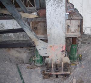 由于礦井凍結(jié)法施工造成后期井口附房產(chǎn)生較大沉降,影響了上部結(jié)構(gòu)的使用。采用頂升法對鋼結(jié)構(gòu)廠房中的沉降較大的鋼柱進行糾偏,該方面需要在鋼柱腹板上焊接鋼牛腿提供頂升支點,同時對鋼柱底部預(yù)埋的螺栓桿體加長,每個鋼柱兩側(cè)設(shè)置兩個頂升千斤頂,經(jīng)過頂升糾偏后該鋼結(jié)構(gòu)廠房基本恢復(fù)原狀