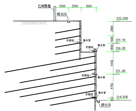 中國華能集團(tuán)公司白楊河電廠新開挖邊坡高14.5m,為永久性邊坡,屬于一級(jí)邊坡,由于邊坡邊緣距離坡頂臨近建筑物圍墻較近,為了保證邊坡建筑物安全和邊坡自身安全,需要對(duì)邊坡進(jìn)行支護(hù)。該方案采用兩級(jí)超前支護(hù)微型樁,坡頂邊緣距離坡頂建筑物外墻邊緣6m,沿頂部坡面設(shè)置三排6m的錨桿(水平間距1.5m),與水平向夾角為15°,保證上部錨桿長度在圍墻以外。沿底部坡面自上而下設(shè)置6排錨桿,其中第2道和第4道為預(yù)應(yīng)力錨桿,第3道為錨桿處于第5層碎石層位置,其主體為Φ48鋼管。在兩級(jí)坡面之間的平臺(tái)寬度為2m。