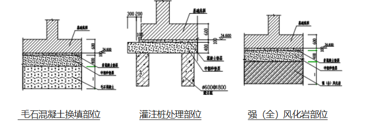 基于以上考慮,經(jīng)過(guò)我單位反復(fù)論證,提出了剛性樁的柔性用法,即東側(cè)仍然采用鉆孔灌注樁,但樁頭不與基礎(chǔ)連接,而是在筏板基礎(chǔ)下做400mm厚的砂墊層。若基底標(biāo)高至全風(fēng)化巖層頂部厚度小于1.0m,則通過(guò)開挖并換填C15毛石混凝土進(jìn)行地基處理,否則通過(guò)二次壓漿灌注樁進(jìn)行地基處理,同時(shí)對(duì)樁間土采用高壓選噴樁進(jìn)行處理。采用通過(guò)墊層調(diào)節(jié)三個(gè)單元的不均勻沉降,使其沉降均勻,對(duì)該建筑物的沉降觀測(cè)結(jié)果表明經(jīng)過(guò)這種方式處理后的建筑物地基沉降均勻,從而驗(yàn)證該剛性樁柔性用法是成功的。