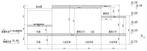 根據(jù)經(jīng)營(yíng)要求,建筑物東側(cè)單體需進(jìn)行加層改造,加層后,原五層頂屋面變?yōu)榱鶎樱鳛檐噹旎蚪?jīng)營(yíng)使用,原五層新世紀(jì)影城搬遷至新建七層。加層設(shè)計(jì)時(shí),結(jié)構(gòu)標(biāo)高布置需在滿足影廳凈高要求的同時(shí)兼顧新加樓層與周邊建筑物車道的交通銜接、屋頂涼水塔、影院放映廳、已有樓梯、電梯等,平面、剖面布置較為復(fù)雜,剖面見圖2。