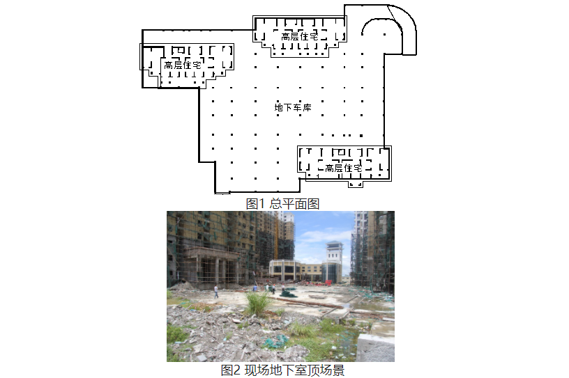 海南某住宅小區(qū),由3棟高層住宅及住宅中間的單層地下車庫組成(圖1、圖2)。三座高層住宅為剪力墻結(jié)構(gòu),筏板基礎(chǔ);地下車庫為框架結(jié)構(gòu),柱下獨(dú)立基礎(chǔ)結(jié)合防水底板,防水底板為梁板式結(jié)構(gòu),防水底板與高層筏板間設(shè)后澆帶。