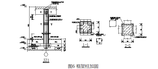 現(xiàn)場檢測發(fā)現(xiàn),車庫上浮導(dǎo)致柱開裂且絕大部分柱產(chǎn)生了受壓區(qū)混凝土壓碎現(xiàn)象,柱發(fā)生受壓破壞,故采用加大截面方法對車庫內(nèi)55棵框架柱進(jìn)行加固。原柱每邊外擴(kuò)10cm,增設(shè)豎向鋼筋及箍筋,采用高強(qiáng)免振搗灌漿料澆筑,見圖6。