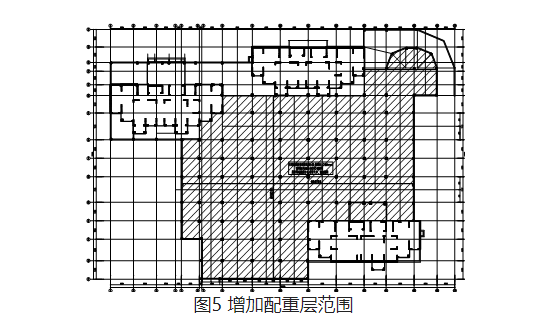 根據(jù)建筑完工后總平面中的場地最低點(diǎn),抗浮設(shè)計(jì)水頭按4.5m對車庫部分結(jié)構(gòu)進(jìn)行復(fù)核驗(yàn)算,復(fù)核驗(yàn)算內(nèi)容包括整體抗浮計(jì)算和局部抗浮計(jì)算。結(jié)合驗(yàn)算結(jié)果及現(xiàn)場檢測情況,在車庫現(xiàn)有地面上增設(shè)20cm厚混凝土層,如圖5中陰影所示。
