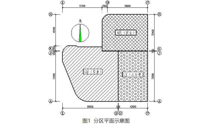 本工程地下部分連為整體,地上部分設(shè)置抗震縫,將整個結(jié)構(gòu)分為三個獨立的結(jié)構(gòu)單元:超高層辦公樓及與之連為一體的裙樓部分為A區(qū),A區(qū)北側(cè)的商業(yè)裙樓部分為B區(qū),A區(qū)西側(cè)的商業(yè)裙樓部分為C區(qū),青島銀座結(jié)構(gòu)分區(qū)示意圖見圖1。