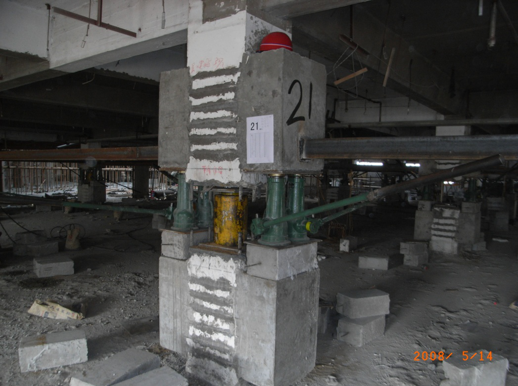 (3)、頂升施工和位移控制:因該建筑物的頂升高度較大,位移控制和千斤頂行程的循環(huán)使用是兩個關(guān)鍵問題。位移控制主要是通過控制每臺千斤頂?shù)奈灰仆絹泶_保建筑物整體同步抬升。千斤頂行程的循環(huán)使用主要利用已截斷的框架柱作為臨時支承點,完成千斤頂?shù)男遁d,回程和重新安裝。