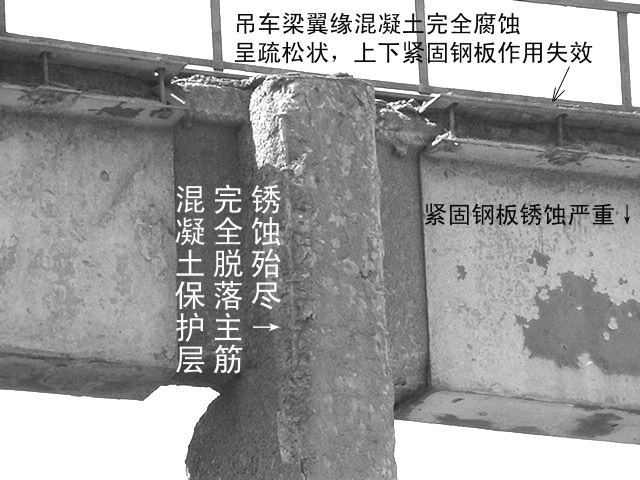 濟南鋼鐵廠除渣車間,吊車梁鋼筋銹蝕,混凝土疏松。通過我所對其進行鑒定及加固,滿足了安全使用要求。
